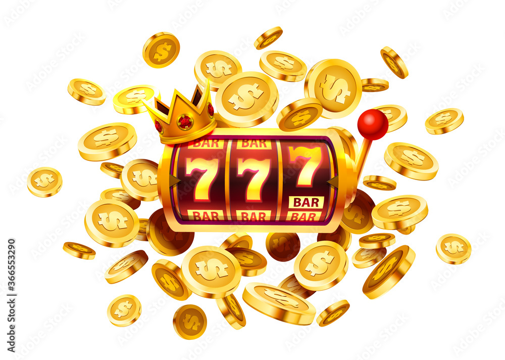 Fototapeta Slots 777 banner, golden coins jackpot, Casino 3d cover, slot machines and roulette with cards