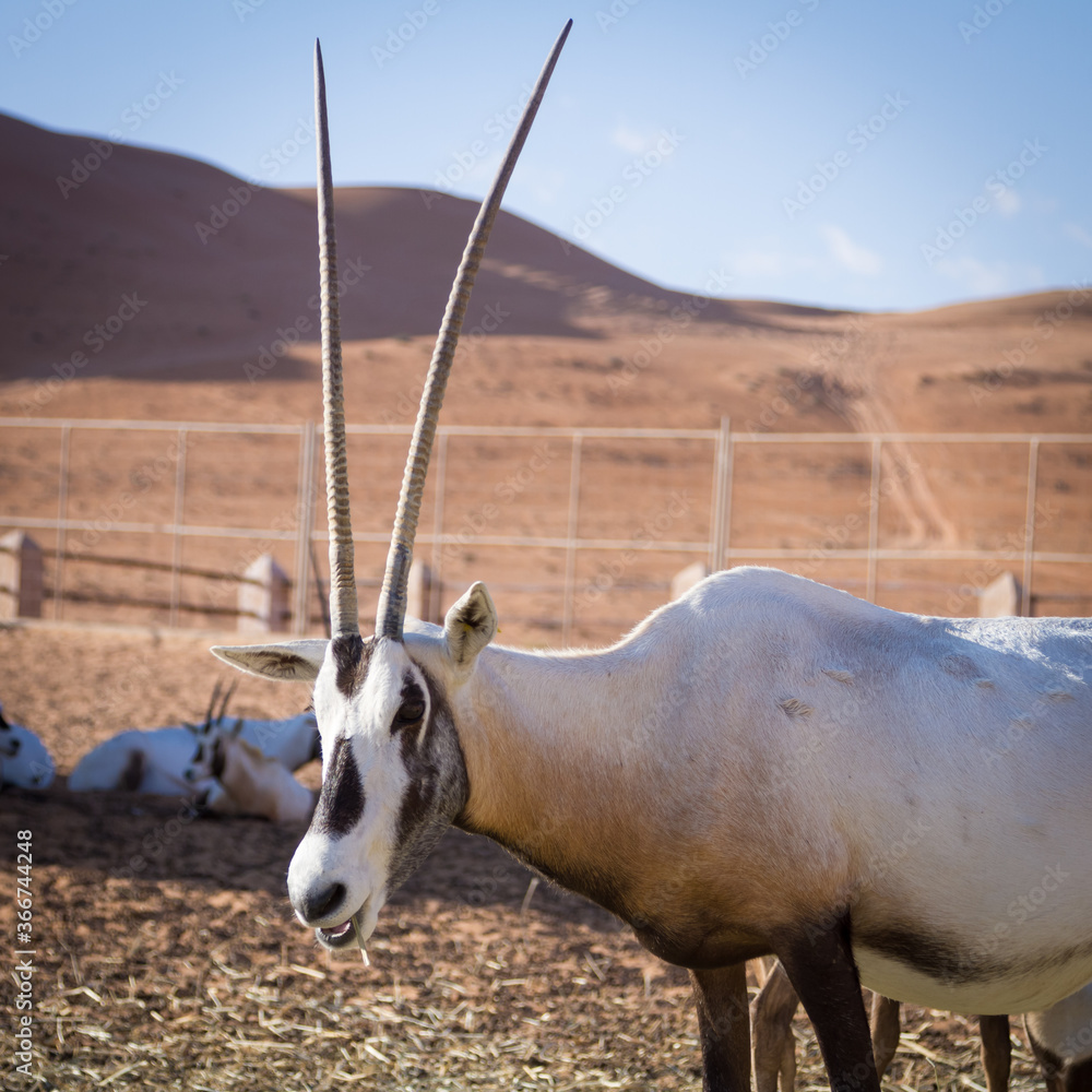 Fototapeta Large antelopes with spectacular horns, Gemsbok, Oryx gazella, being bred in captivity in Oman desert