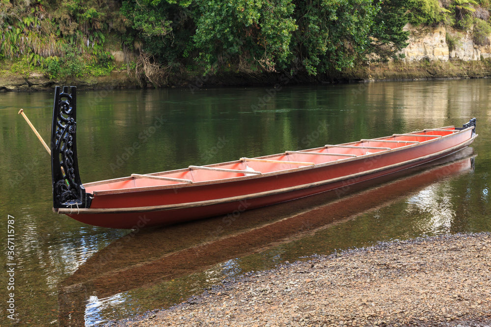 Fototapeta A Maori waka (canoe) with ornamental carvings on the stern post in the Waikato R