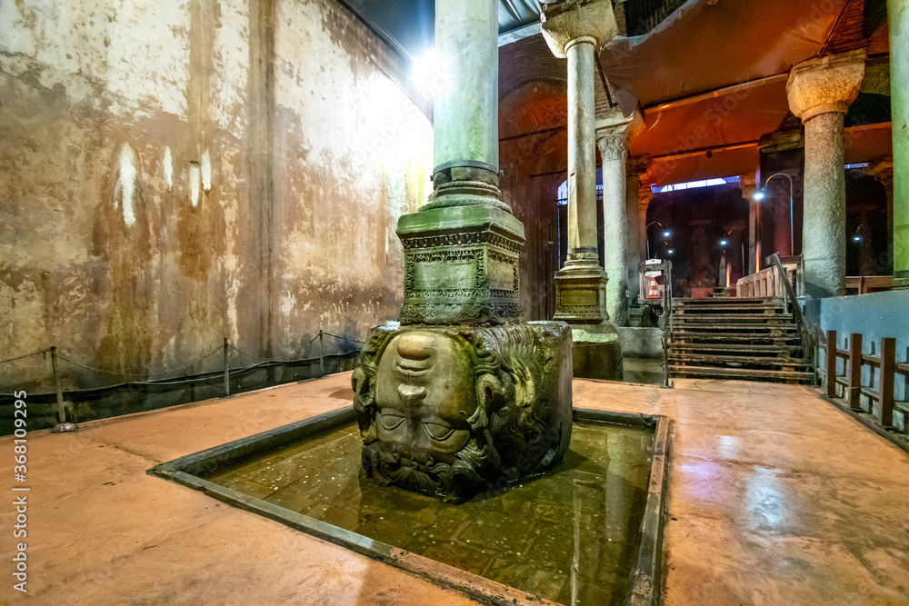 Fototapeta The upside down stone Medusa head column in the ancient underground Basilica Cis