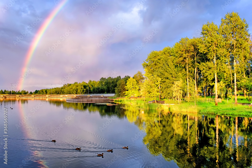 Fototapeta city park landscape with scenery reflection on duck pond water after thunderstorm with bright rainbow on background