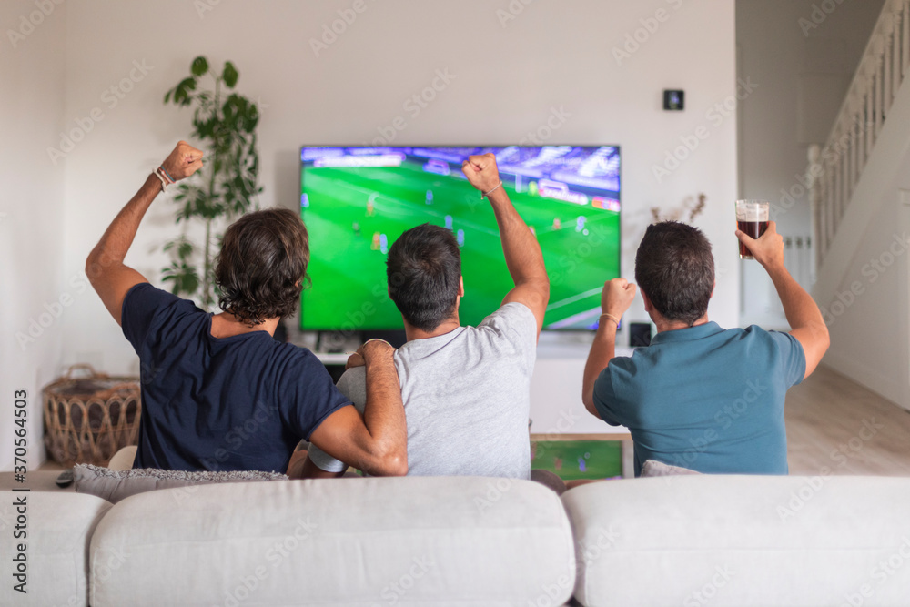 Fototapeta Group of friends watching a game on tv celebrating the victory of their team