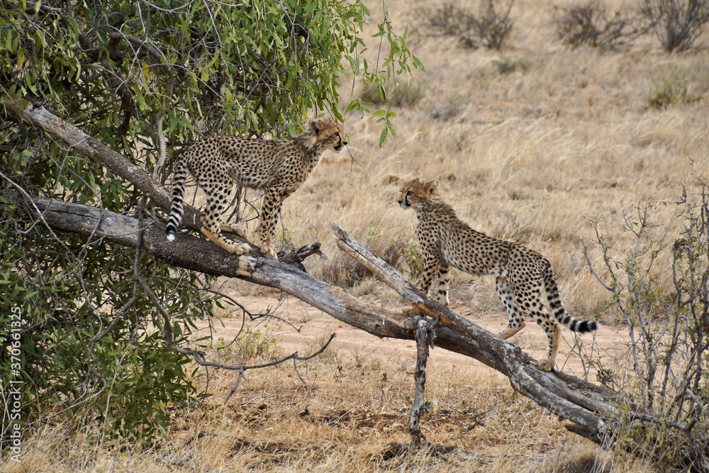 Fototapeta Young cheetahs on play tree, Samburu Game Reserve, Kenya