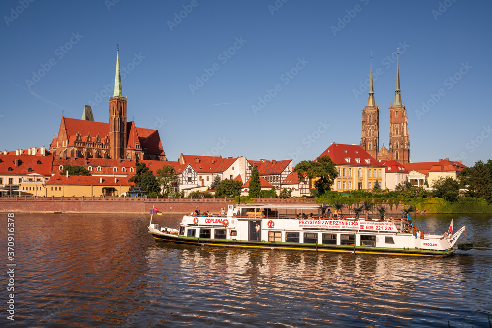 Fototapeta Wroclaw, Poland 04 August 2020; Summer riverscape view in Wroclaw city on the Oder