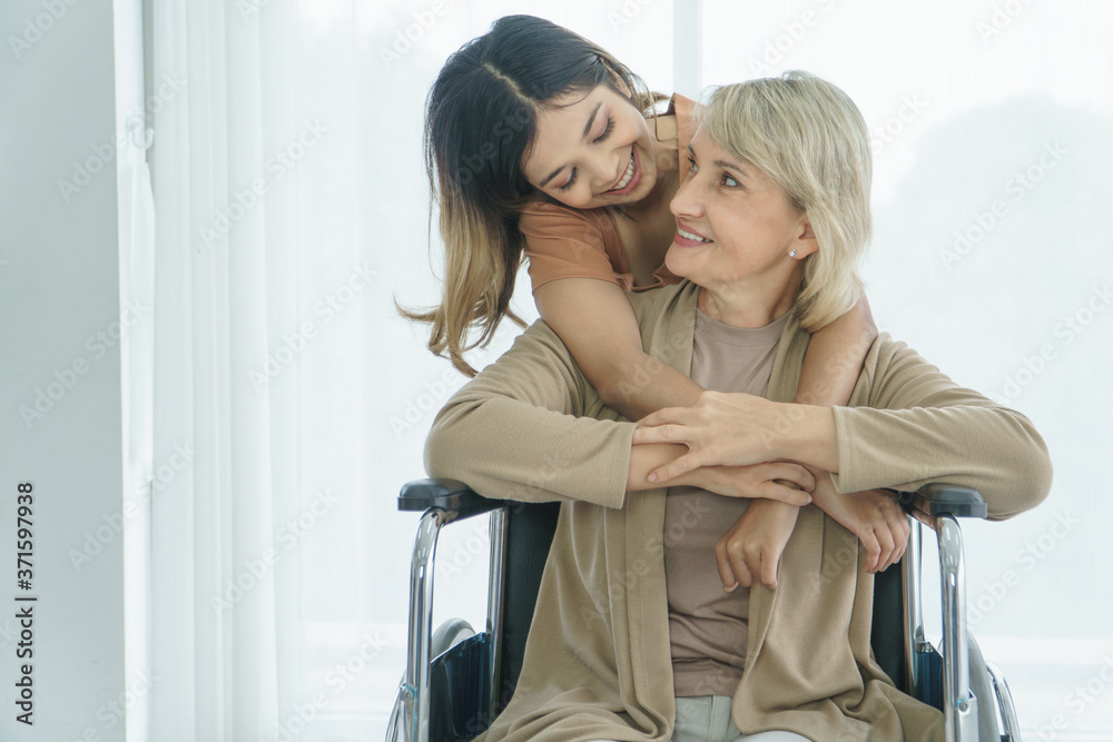 Fototapeta Grandma hugs granddaughter and smiling happily