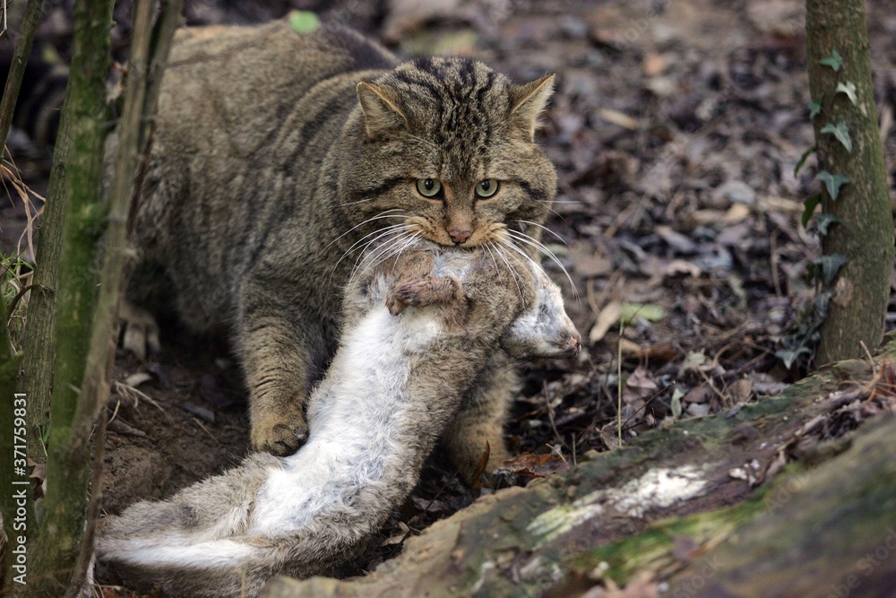 Fototapeta European Wildcat, felis silvestris, with a Kill, an European rabbit