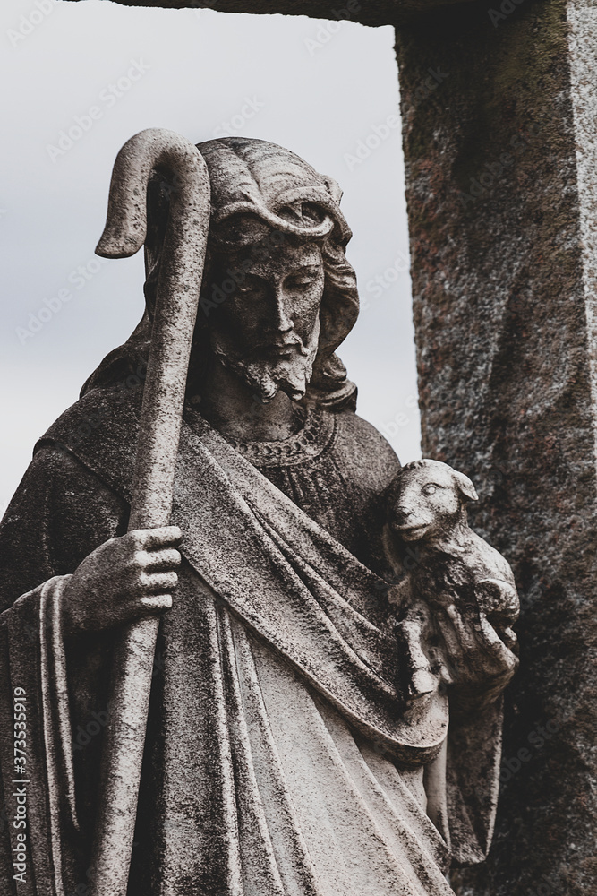 Fototapeta Dark contrast image of Jesus figure holding baby lamb and Shepard’s crook/staff