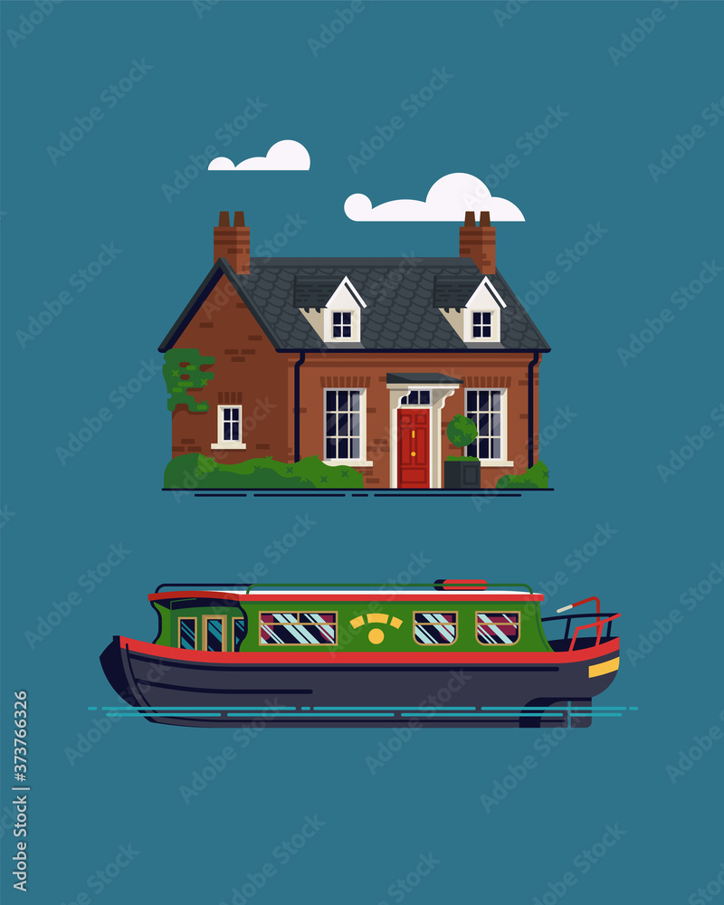 Fototapeta Cute flat design vector illustration on British countryside vacation and recreat