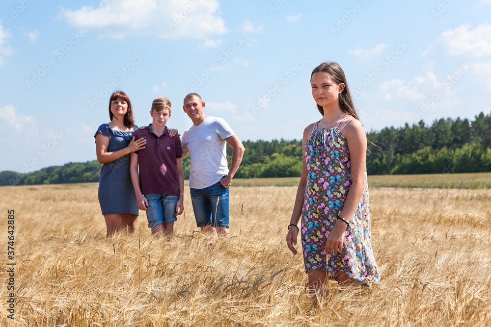 Fototapeta Concept of adopted kid, pretty girl standing on foreground with adoptive family