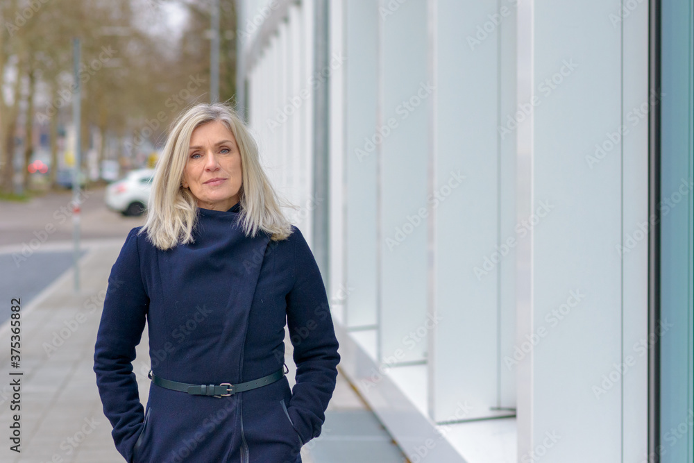 Fototapeta Attractive stylish woman in blue winter overcoat