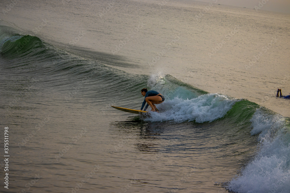 Fototapeta A foreign girl swimming in the sea on the waves, surfing