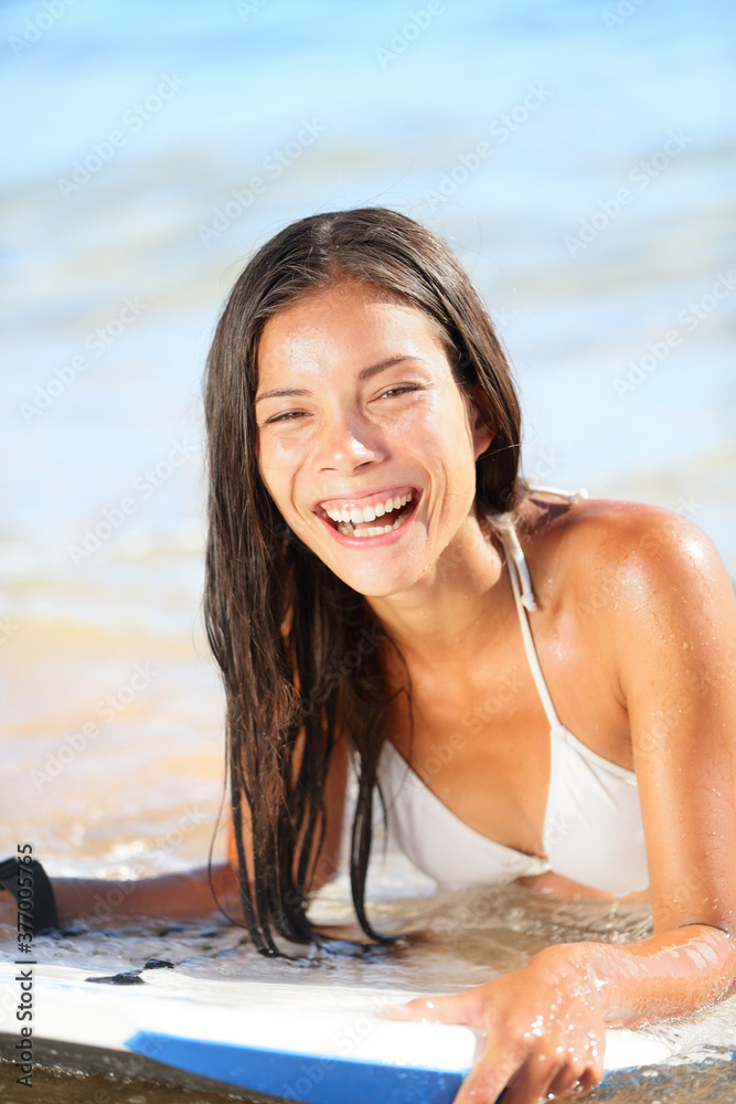 Fototapeta Water sport fun - beach woman bodyboarding surfing on bodyboard or boogieboard