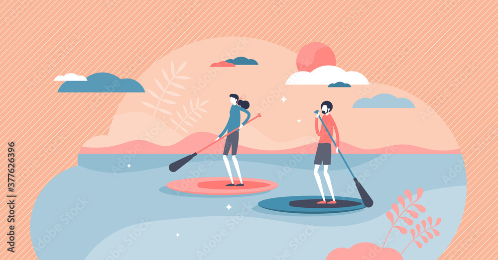 Fototapeta Suping or standing paddleboarding water sport adventure tiny person concept