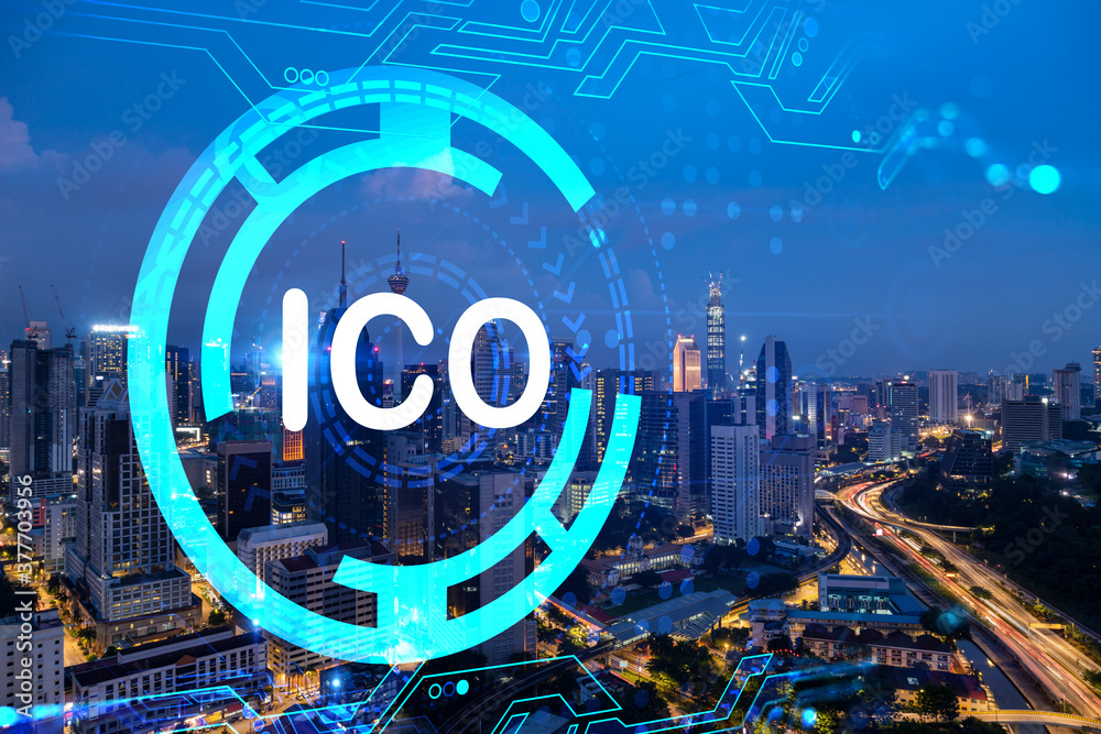 Fototapeta Initial coin offering hologram, night panorama city view of Kuala Lumpur