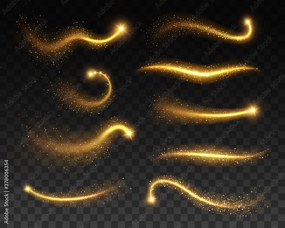 Fototapeta Stars with glowing golden sparkles, vector light effects on transparent background