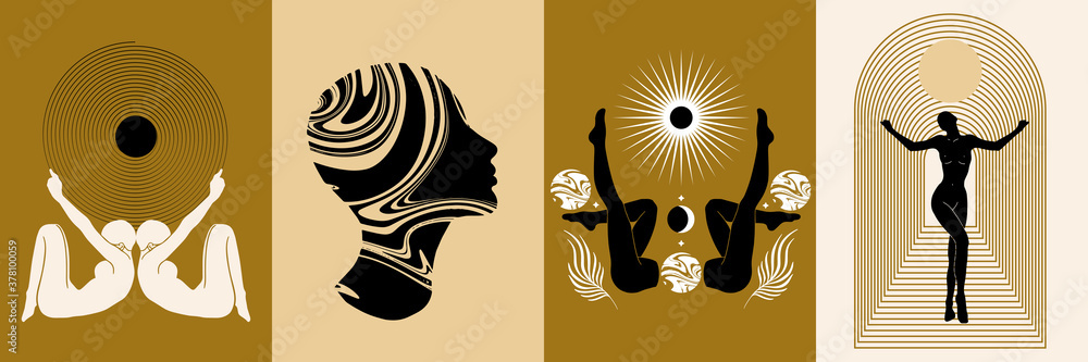 Fototapeta Vector set of hand drawn illustration yogi, geometrical elements,female profile