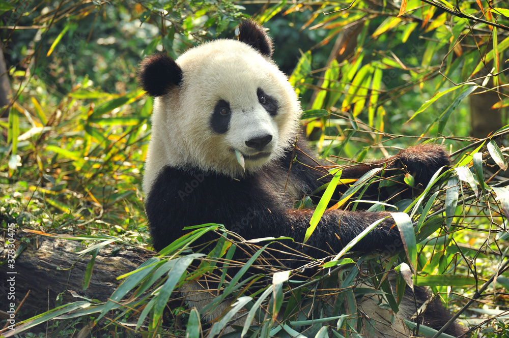 Fototapeta Hungry giant panda bear eating bamboo