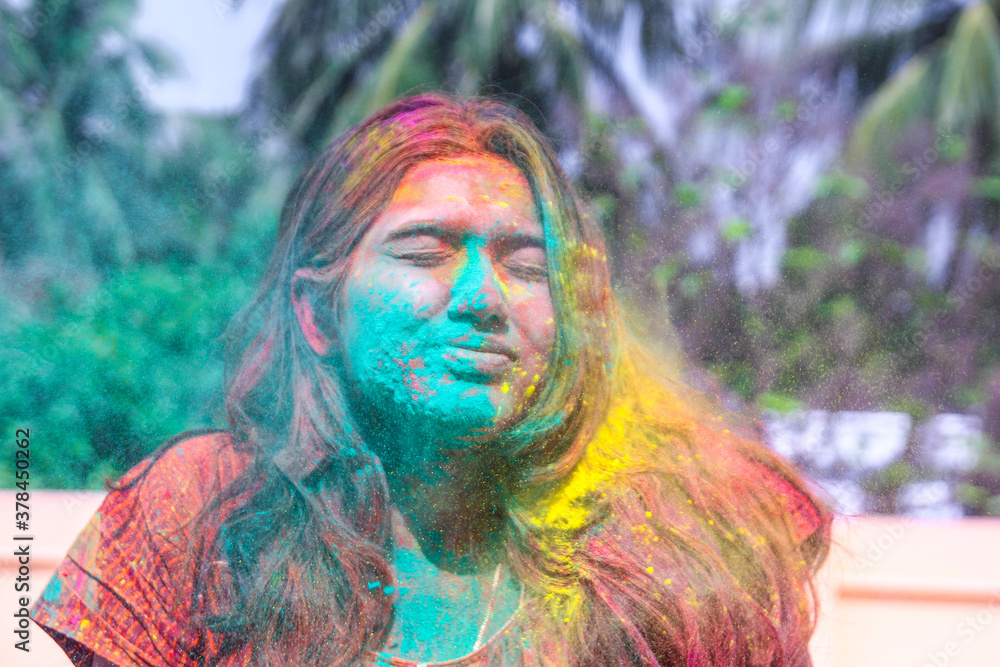 Fototapeta a lady getting showered with holi colours during holi festival in india