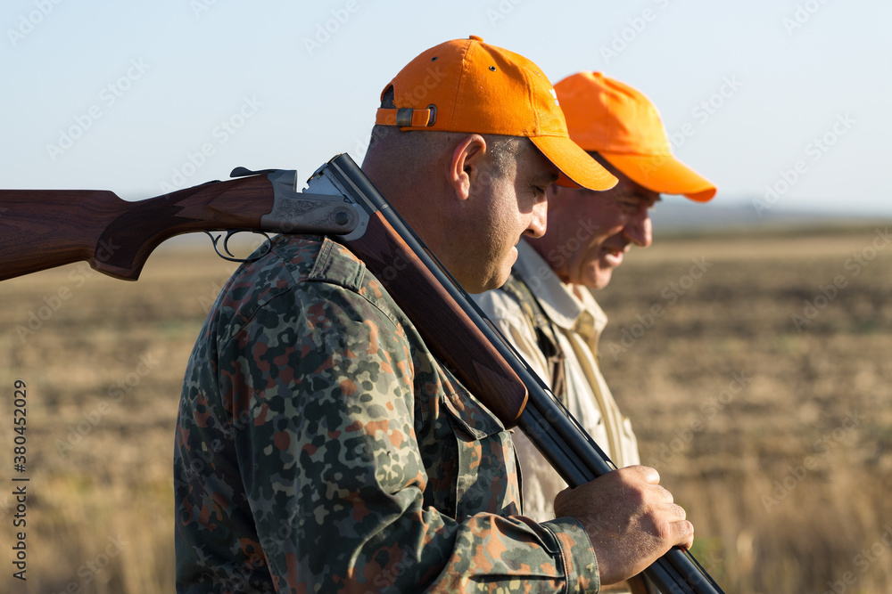 Fototapeta Duck hunters with shotgun walking through a meadow.