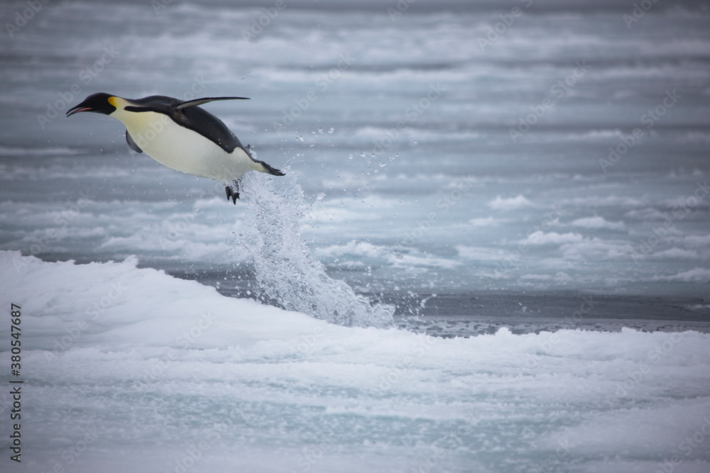 Fototapeta Antarctica emperor penguin flying out of the water close up on a cloudy winter d