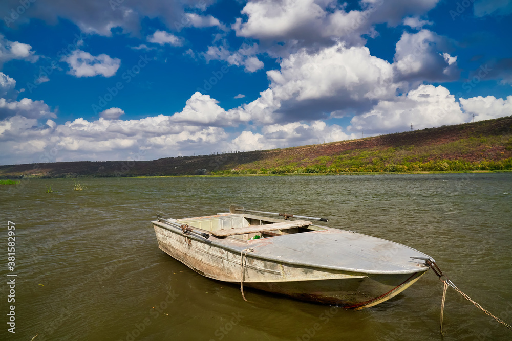 Fototapeta Old metal fishing boat moored in the shallow waters of the river