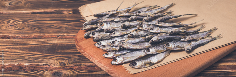 Fototapeta Dried fish on a wooden background. Studio photo.
