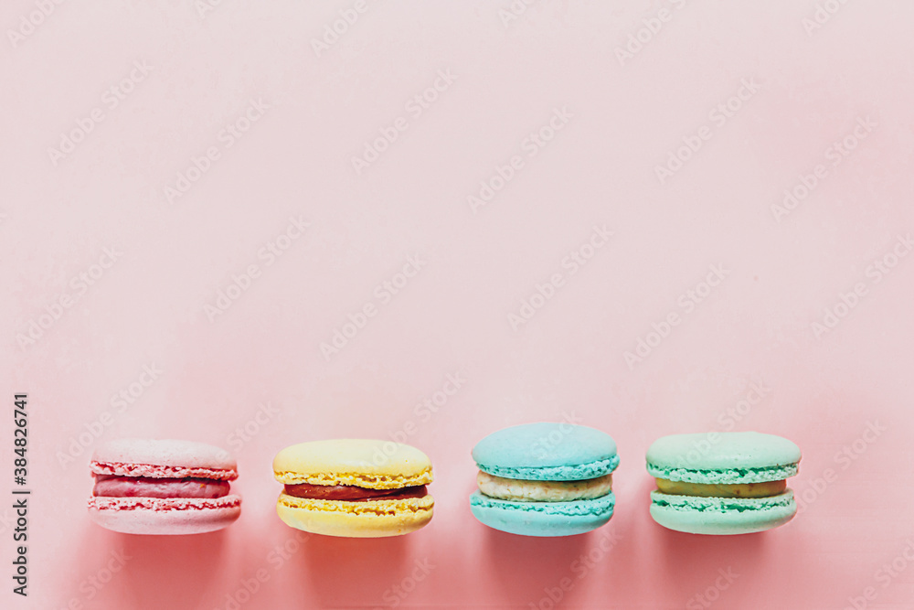 Fototapeta Sweet almond colorful pink blue yellow green macaron or macaroon dessert cake isolated on trendy pink pastel background