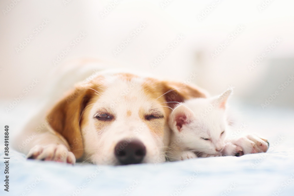 Fototapeta Cat and dog sleeping. Puppy and kitten sleep.