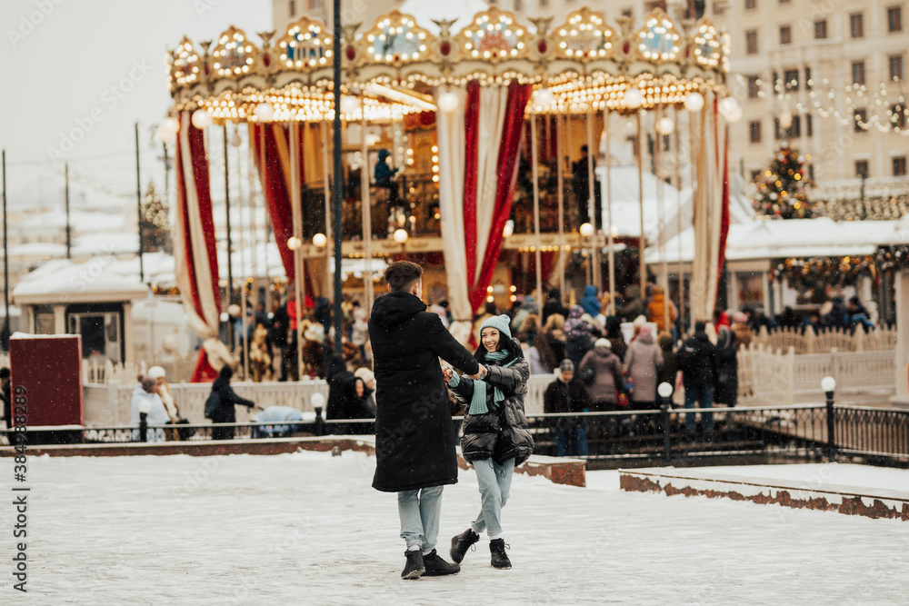 Fototapeta Young romantic couple is having fun outdoors in winter at the amusement park