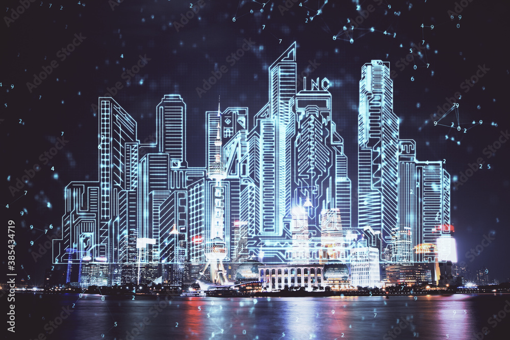 Fototapeta Double exposure of buildings hologram over cityscape background