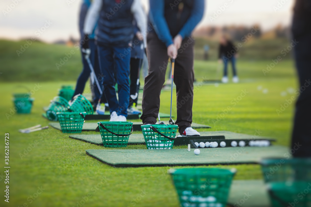 Fototapeta Group of golfers practicing and training golf swing on driving range practice, m