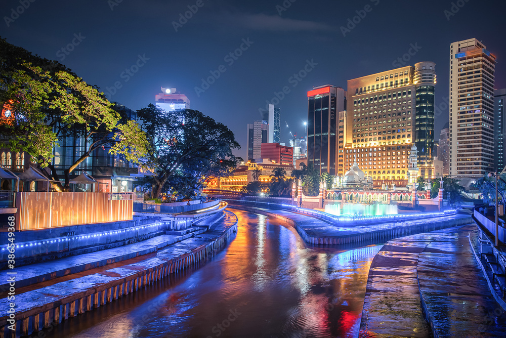 Fototapeta Masjid Jamek and the blue pool in the heart of city center Kuala Lumpur at night in Malaysia