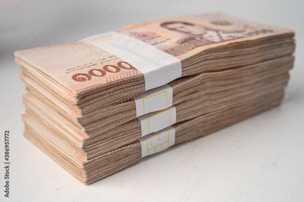 Fototapeta Stack of Thai baht banknotes on wooden background, business saving finance investment concept