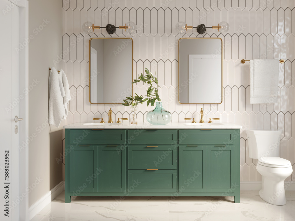 Fototapeta 3d modern contemporary chic beige bathroom with two rectangle brass mirrors and