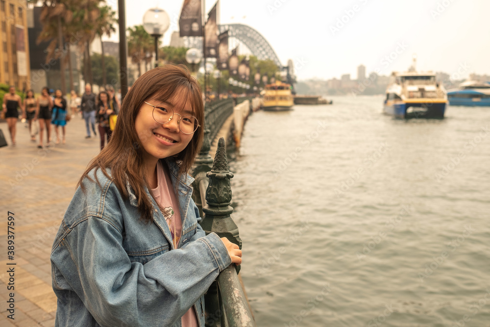Fototapeta Shallow focus shot of an Asian female enjoying the holiday in Sydney, Australia
