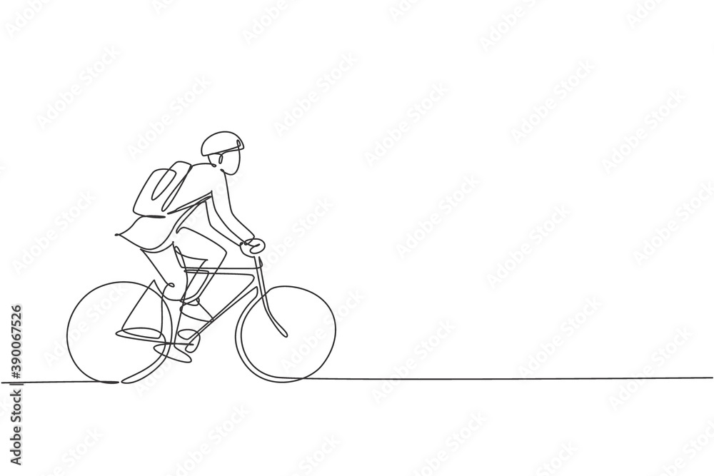 Fototapeta Single continuous line drawing young professional businessman riding bicycle to his company