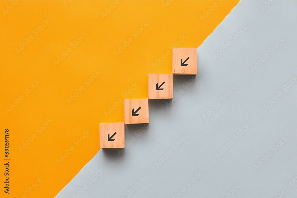 Fototapeta Wooden cubes with down arrows. The decline in sales, development