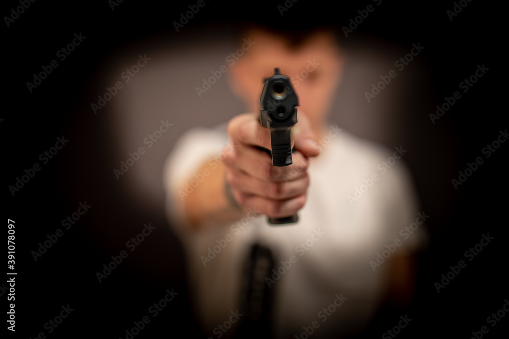 Fototapeta Man with gun facing to camera, pistol, weapon, dangerous, robbery,