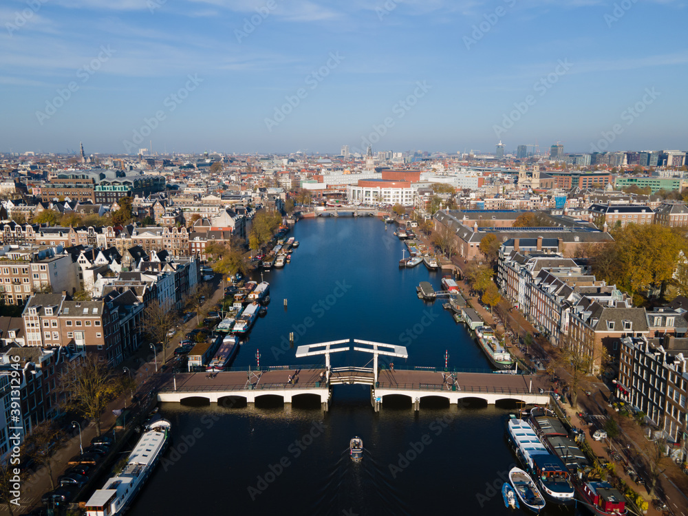 Fototapeta Amsterdam, The Netherlands, 7th November 2020 Aerial view of the Magere Brug Ams