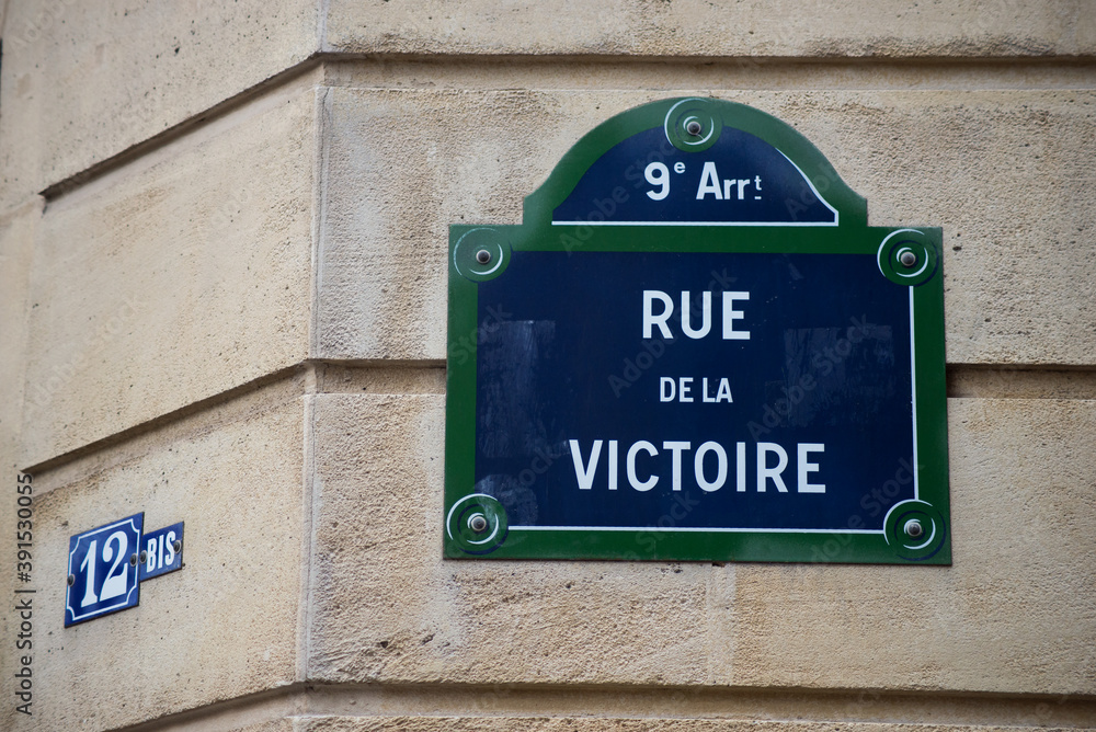 Fototapeta Closeup of Victory street name on the traditional parisian street plate on stone
