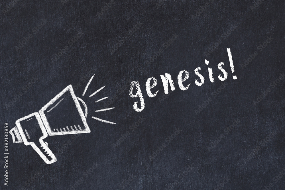 Fototapeta Chalk loudspeaker and inscription genesis on black chalkboard