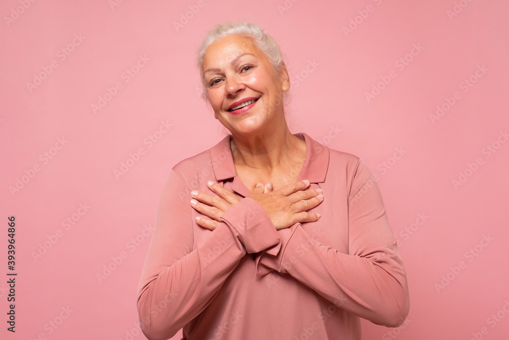 Fototapeta Delighted happy charming old lady with white hair smiling at camera