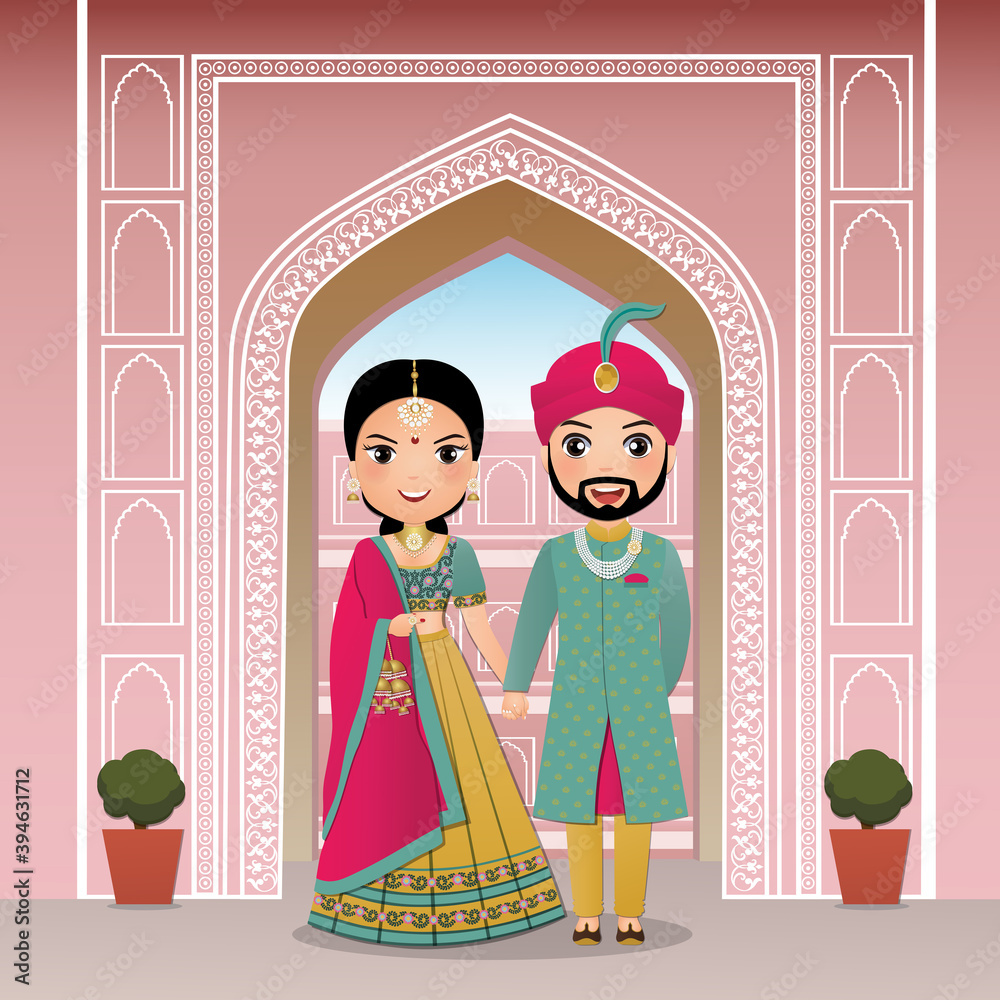 Fototapeta Wedding invitation card the bride and groom cute couple in traditional indian dress cartoon character