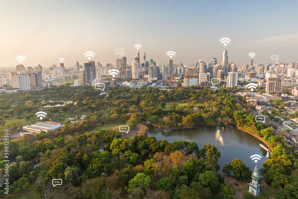 Fototapeta Lumpini (Lumphini) Park and Bangkok city in Thailand viewed from above