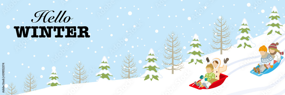 Fototapeta Children sledding in the winter snowcoverd slope - included greeting words Hell