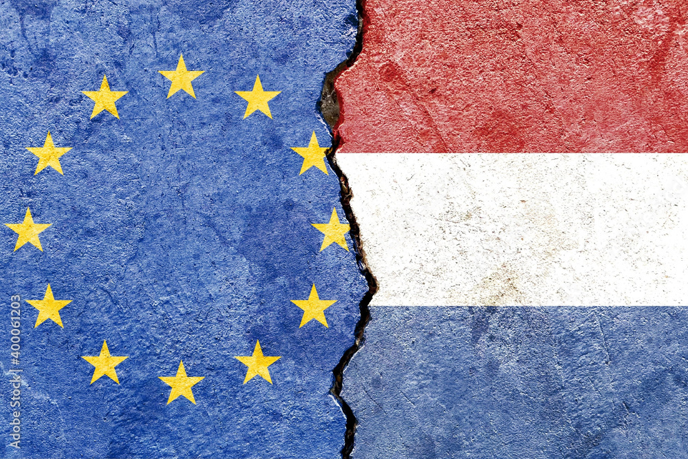 Fototapeta EU and Dutch flag on a cracked wall-politics, war, conflict concept