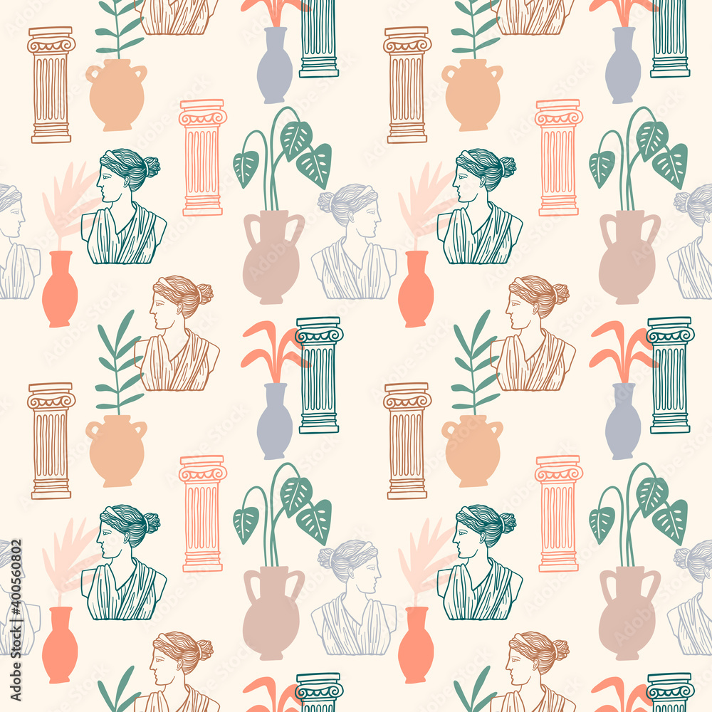 Fototapeta Seamless pattern with Greek Roman Goddess sculpture, ancient ionic order column and vases