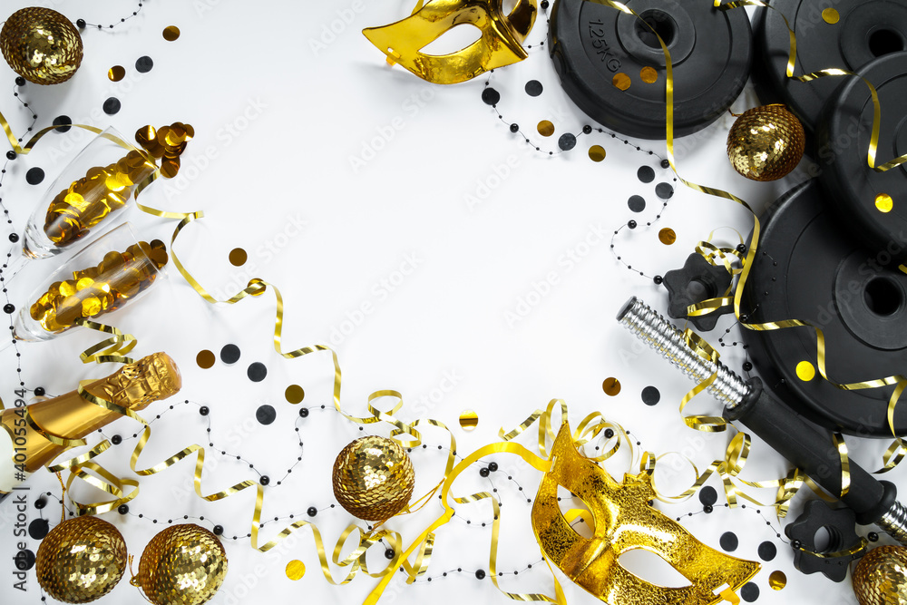 Fototapeta Dumbbells weight plates, golden decorations, confetti, masks, champagne bottle, glasses for New Year's Eve celebration