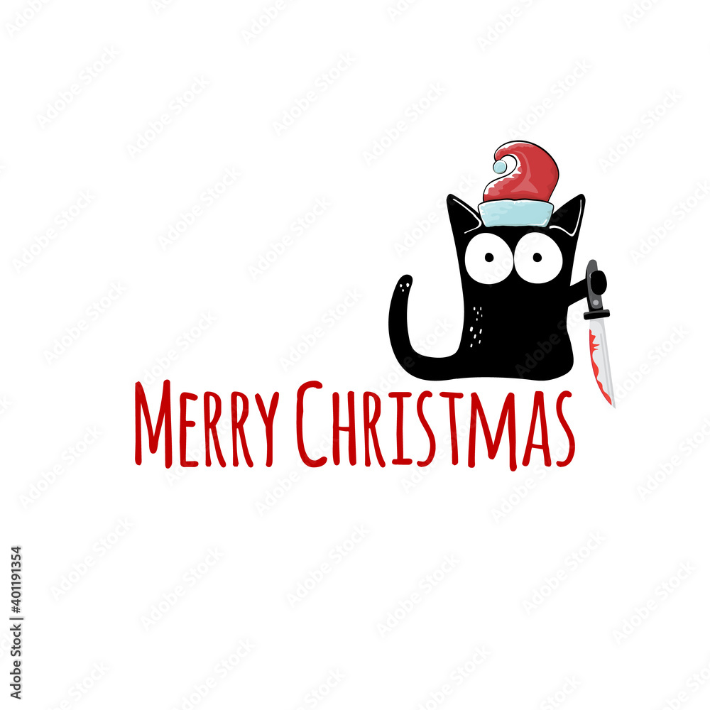 Fototapeta Merry Christmas greeting card or banner with Black cat with Santa hat holding bloody ax isolated on white background