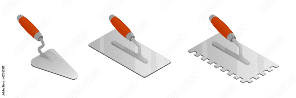 Fototapeta Set of isometric vector illustrations bricklayer and stucco trowels isolated on white background